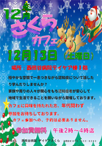 さくらカフェのご案内 ほっと一息つきながら、悩みの相談、認知症について、一緒に話したり、学んだりしてみませんか? 認知症になっても、安心して生活が出来る地域になる事を願いながら開催しています。 ※さくらカフェは、認知症の方やそのご家族、また地域の方が気軽に、自由につどう場所です。 カフェに興味を持たれた方、年代問わず参加をお待ちしております。(予約不要) 日程:2025年12月13日(土) 午後2時〜4時 会場:西熊谷病院内 デイケア棟1階 費用:無料 ※お電話にてお問い合わせ下さい。 【デイケアさくら 電話:048-522-0203】 |