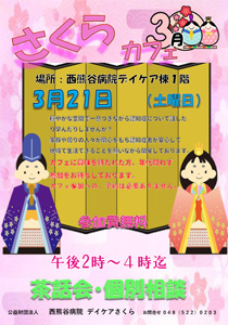 さくらカフェのご案内 ほっと一息つきながら、悩みの相談、認知症について、一緒に話したり、学んだりしてみませんか? 認知症になっても、安心して生活が出来る地域になる事を願いながら開催しています。 ※さくらカフェは、認知症の方やそのご家族、また地域の方が気軽に、自由につどう場所です。 カフェに興味を持たれた方、年代問わず参加をお待ちしております。(予約不要) 日程:2026年3月21日(土) 午後2時〜4時 会場:西熊谷病院内 デイケア棟1階 費用:無料 ※お電話にてお問い合わせ下さい。 【デイケアさくら 電話:048-522-0203】 |
