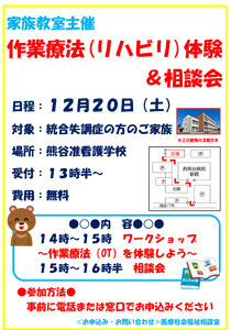 作業療法(リハビリ)体験&相談会のご案内 当院で実施している精神科作業療法(リハビリ)体験と多職種に相談ができる機会をもうけました。 相談会では薬剤師、看護師、作業療法士、精神保健福祉士、管理栄養士がご相談にのりますので、 この機会にぜひご参加ください。 日程:令和7年12月20日(土)午後2時〜午後4時30分 会場:熊谷准看護学校 対象:当院通院中の統合失調症のご家族 費用:無料 ※事前にお電話、または窓口にてお申込みください。 【医療社会福祉相談室 電話:048-522-0200(代表)】 |
