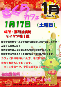 さくらカフェのご案内 ほっと一息つきながら、悩みの相談、認知症について、一緒に話したり、学んだりしてみませんか? 認知症になっても、安心して生活が出来る地域になる事を願いながら開催しています。 ※さくらカフェは、認知症の方やそのご家族、また地域の方が気軽に、自由につどう場所です。 カフェに興味を持たれた方、年代問わず参加をお待ちしております。(予約不要) 日程:2026年1月17日(土) 午後2時〜4時 会場:西熊谷病院内 デイケア棟1階 費用:無料 ※お電話にてお問い合わせ下さい。 【デイケアさくら 電話:048-522-0203】 |
